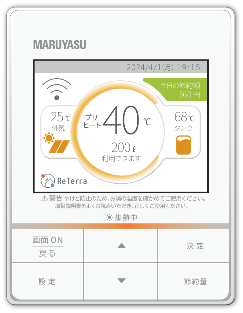 杉浦さん:太陽熱給湯システム「ReTerra」は、集熱器で取り込んだ太陽熱を蓄熱タンク(200L)に伝え、お湯をつくる再生可能エネルギーシステムです。給湯時にはガス給湯器と連携することで、ガス使用量を抑え、光熱費とCO₂排出の双方を削減します。
