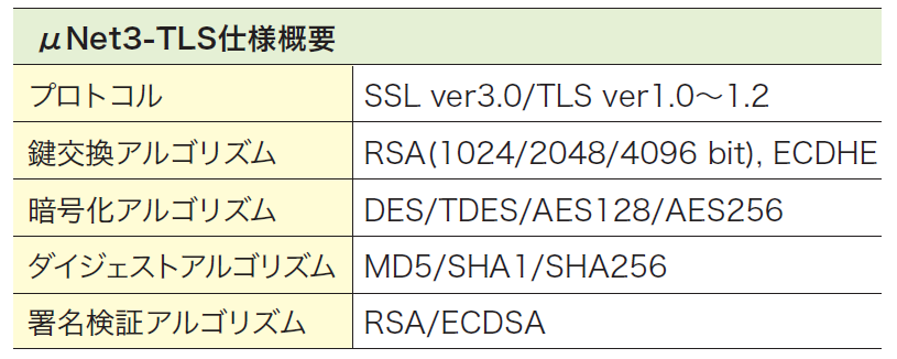 SSL/TLSのクライアント・サーバ機能を提供するプロトコルスタックです。μNet3の仕様を受け継いだシンプルなAPIは既存アプリへのSSL/TLSの導入を容易にします。暗号エンジンが内蔵されているCPUを使用すれば非力なマイコンでも暗号通信が実現できます。